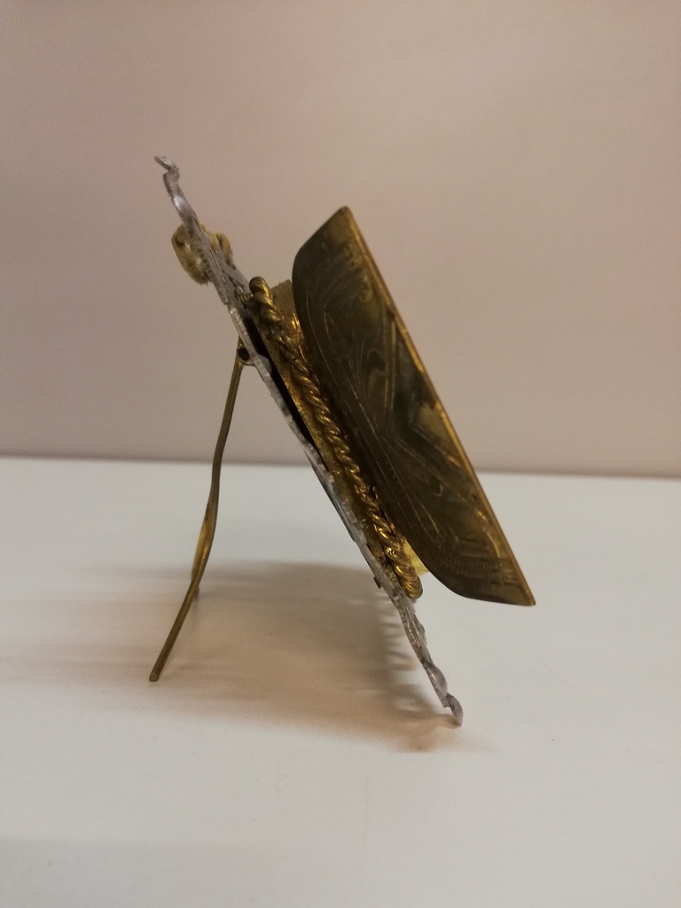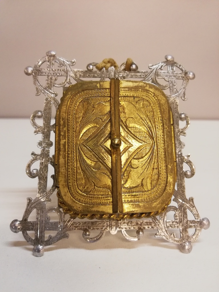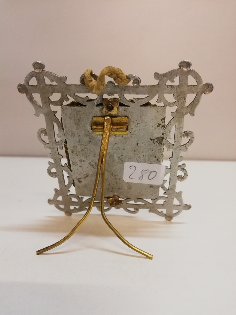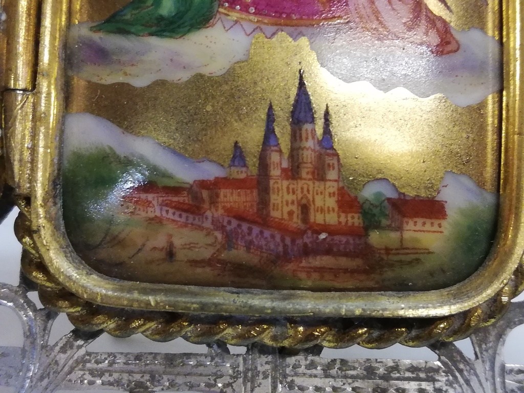 19.Jhdt. Grundplatte aus Weißmetall aus 4 überkreuzten Stäben von Ranken umschlungen, darauf 2-türriges Messingkästchen mit Porzellanmalerei