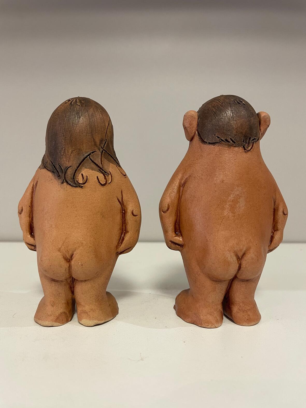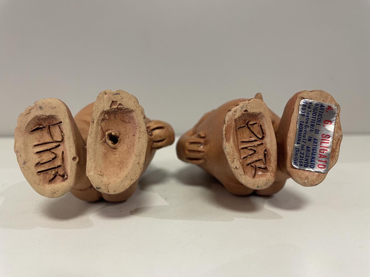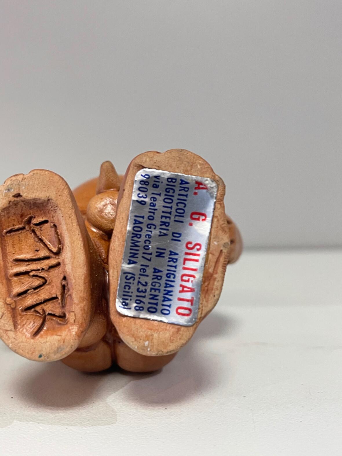Signatur/Marke: in den feuchten Ton der Fußsohle geritzt jeweils: "Plh TK" oder so ähnlich; jeweils am anderen Fuß Afkleber mit gedruckter Aufschrift: "A. G. SILIGATO ARTICOLI DI ARTIGIANATO BIGIOTTERIA IN ARGENTO via Teatro Greco 17 tel. 23168 98039 TAORMINA (Sicilia)"