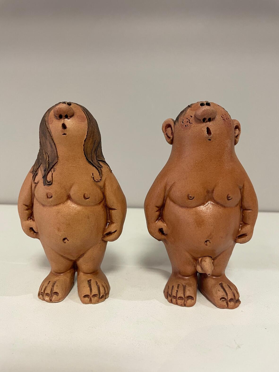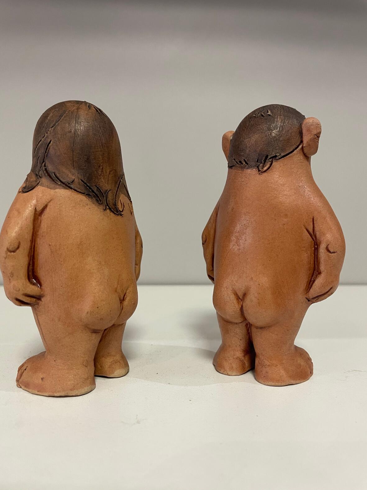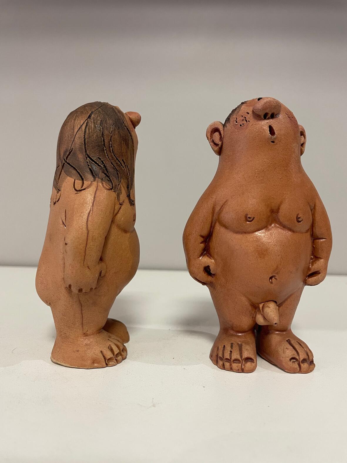 Signatur/Marke: in den feuchten Ton der Fußsohle geritzt jeweils: "Plh TK" oder so ähnlich; jeweils am anderen Fuß Afkleber mit gedruckter Aufschrift: "A. G. SILIGATO ARTICOLI DI ARTIGIANATO BIGIOTTERIA IN ARGENTO via Teatro Greco 17 tel. 23168 98039 TAORMINA (Sicilia)"