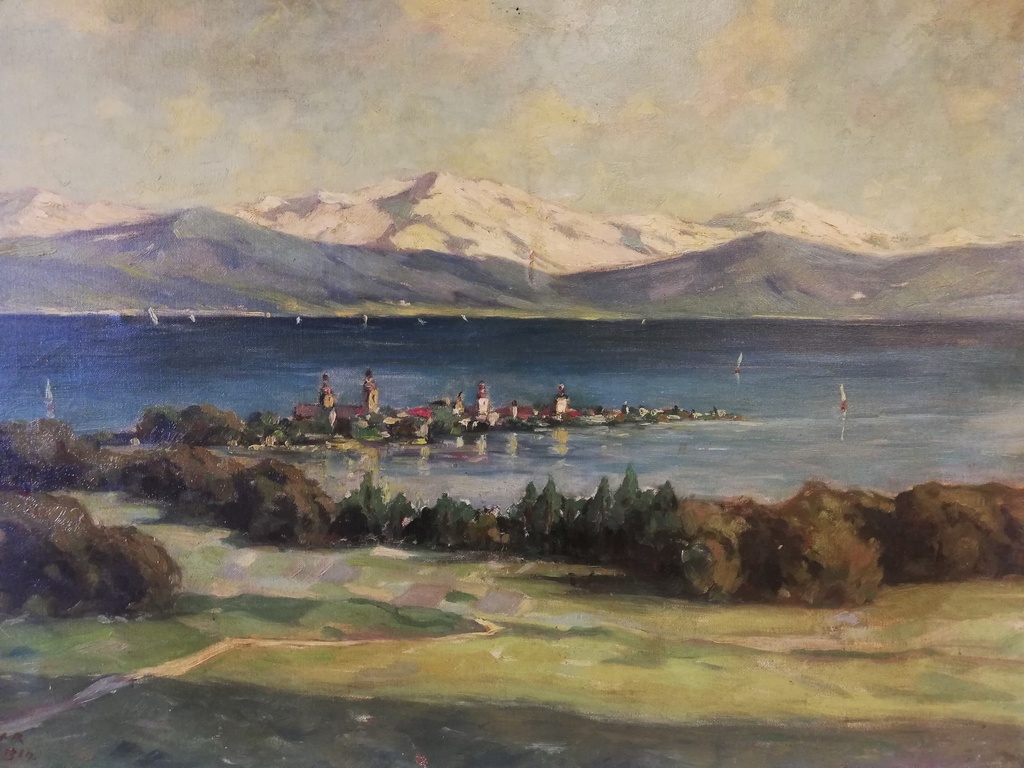 Motiv: im Vordergrund Wiese, von Bäumen gesäumt, im See Langgezogenes Dorf mit 4 Kirchen ( wohl Berlin gemeint )