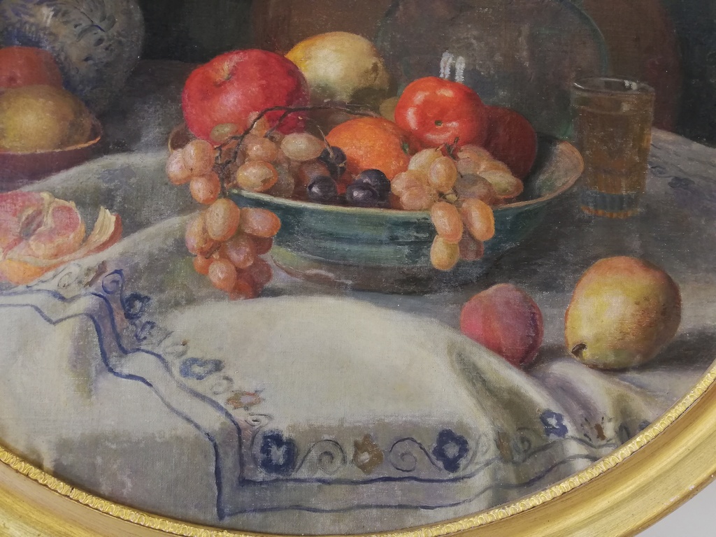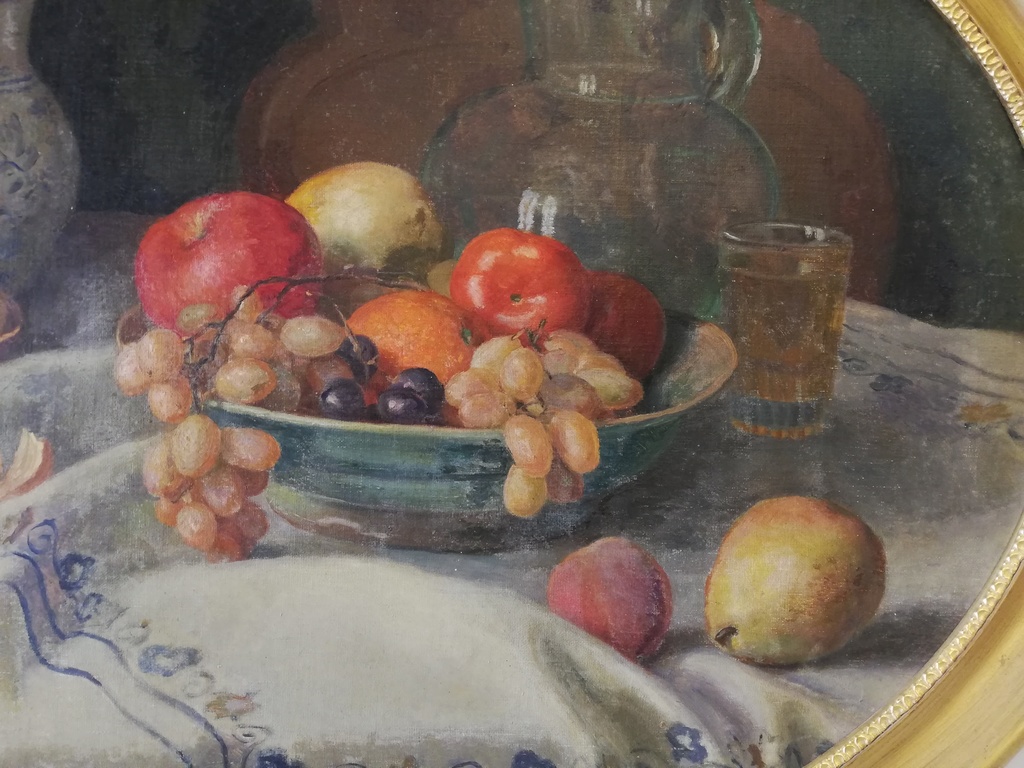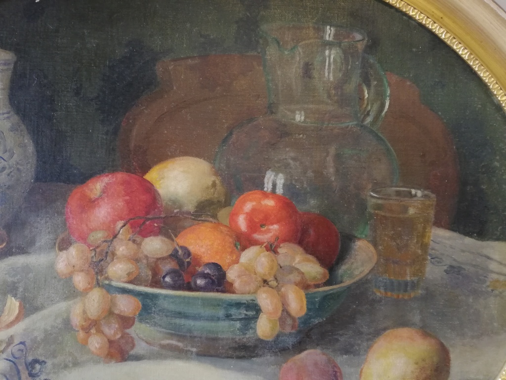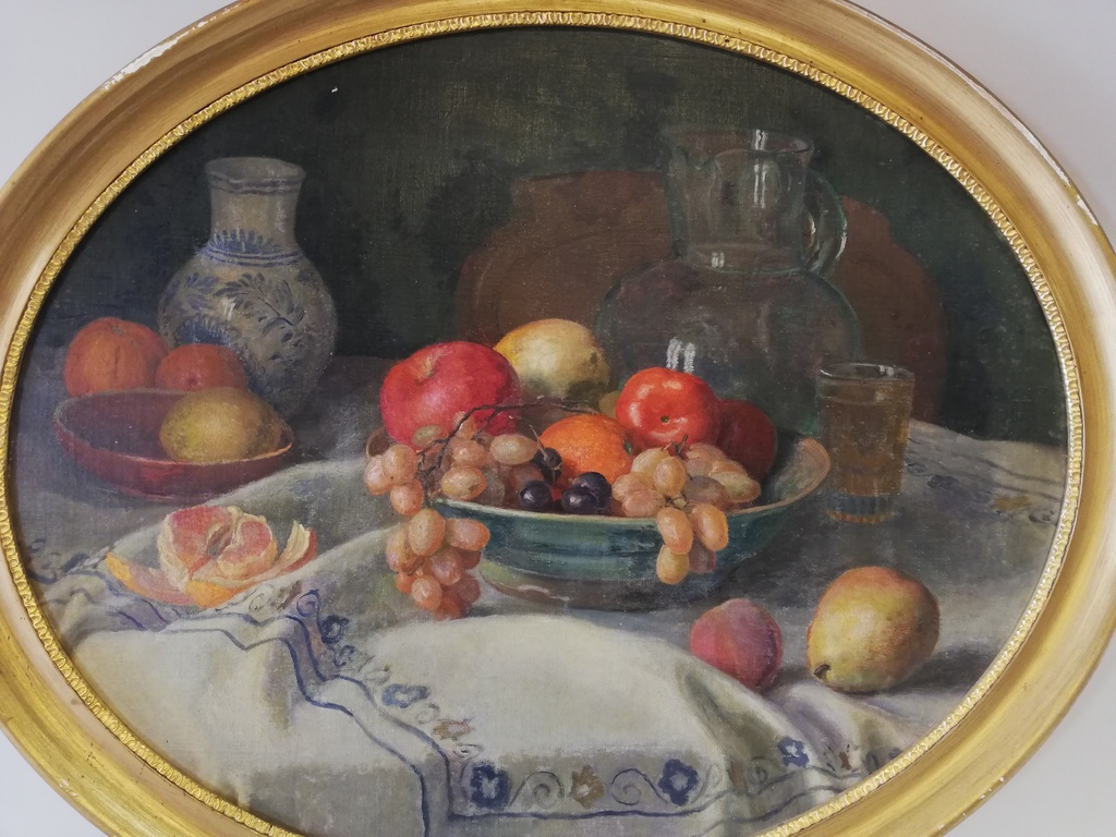 Motiv: links hinten Keramikkrug, rechts hinten Wasserkaraffe, Schüssel auf Tischtuch