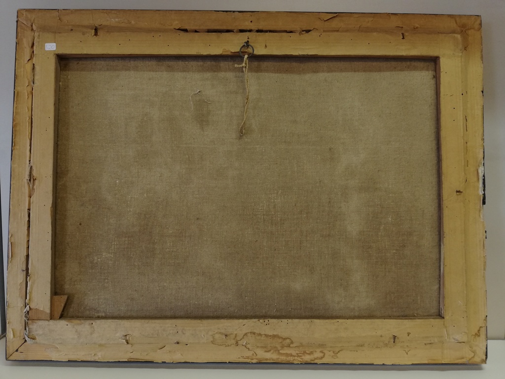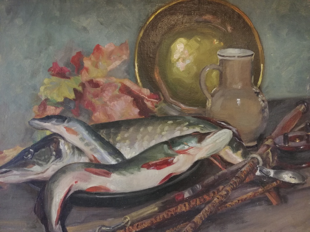 20.Jhdt Öl auf Leinwand , Fischstilleben, rechts hinter Fischen auf Platte ist Krug und Schüssel, im Vordergrund Angel .