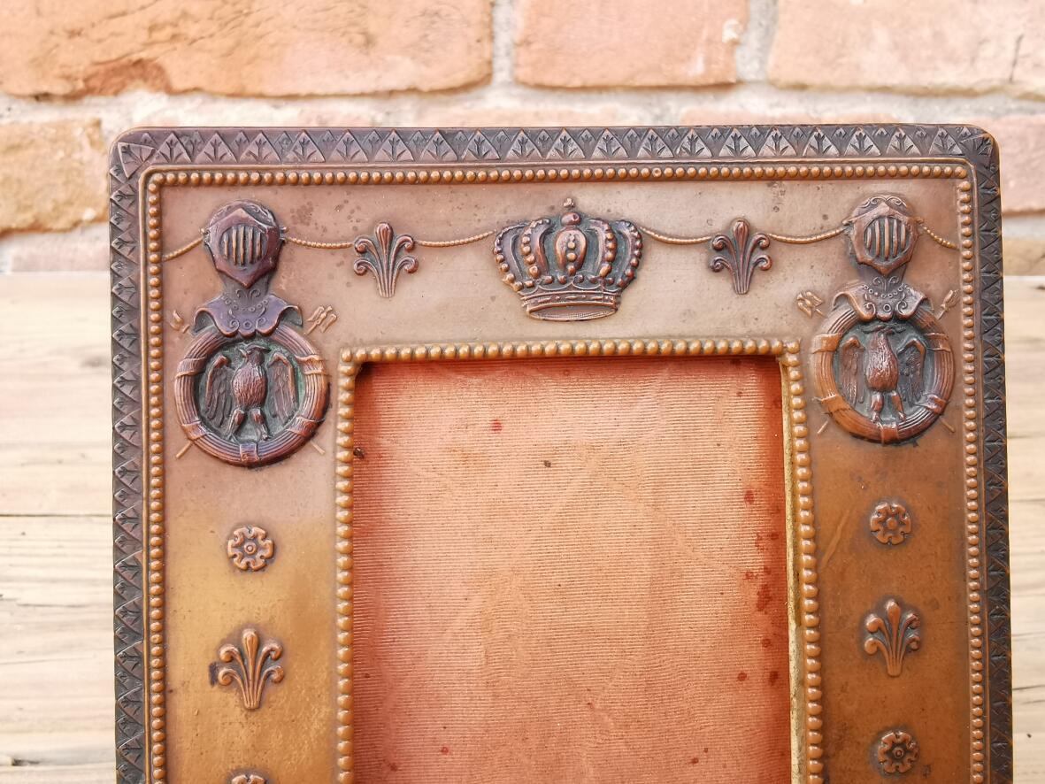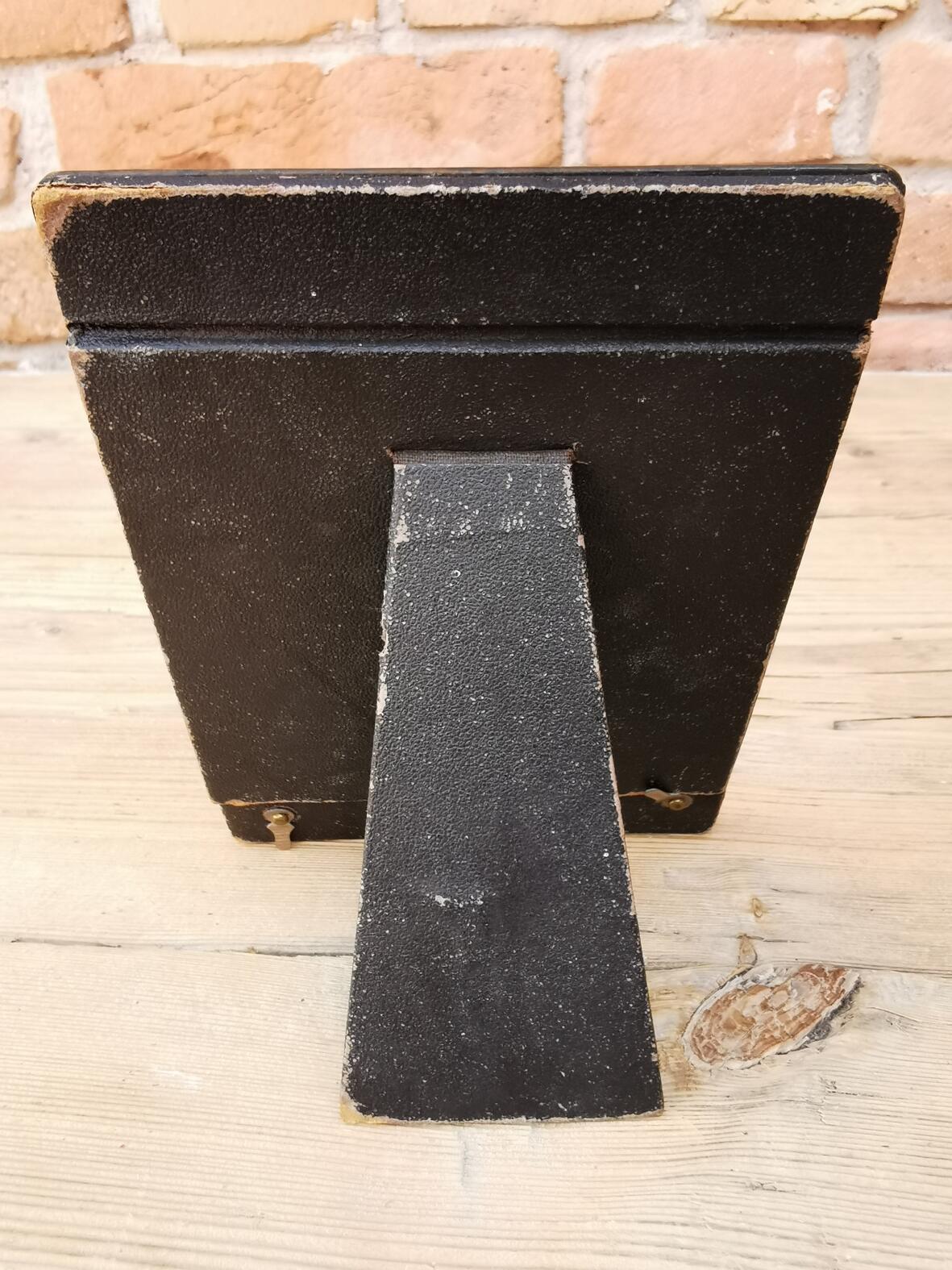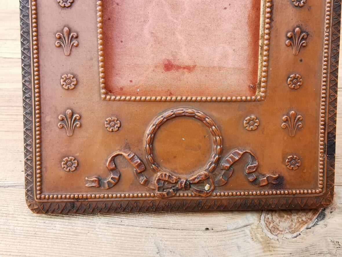 um 1910, Karton, außen mit Kupfer beschlagen, aufklappbar, Seidenhintergrund, Stütze an Rückseite.