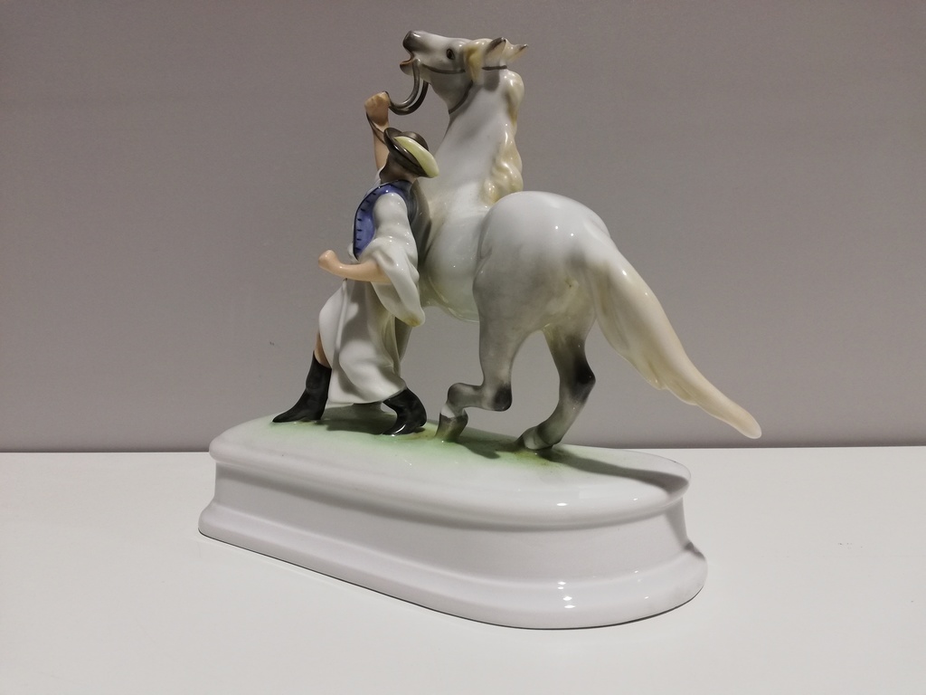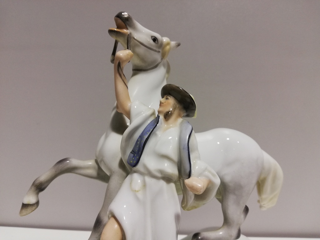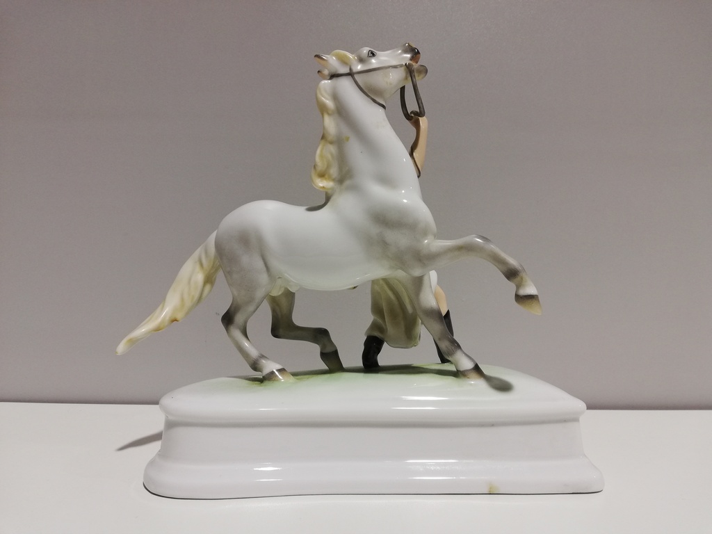 Darstellung: Ungar hält sich aufbäumendes Pferd am Zügel