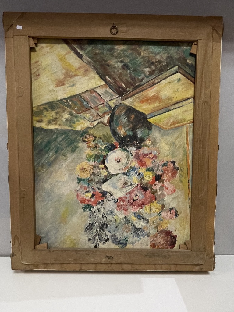 Darstellung: an der Vordersteite dunkleres und an der Rückseite helleres Blumenstilleben