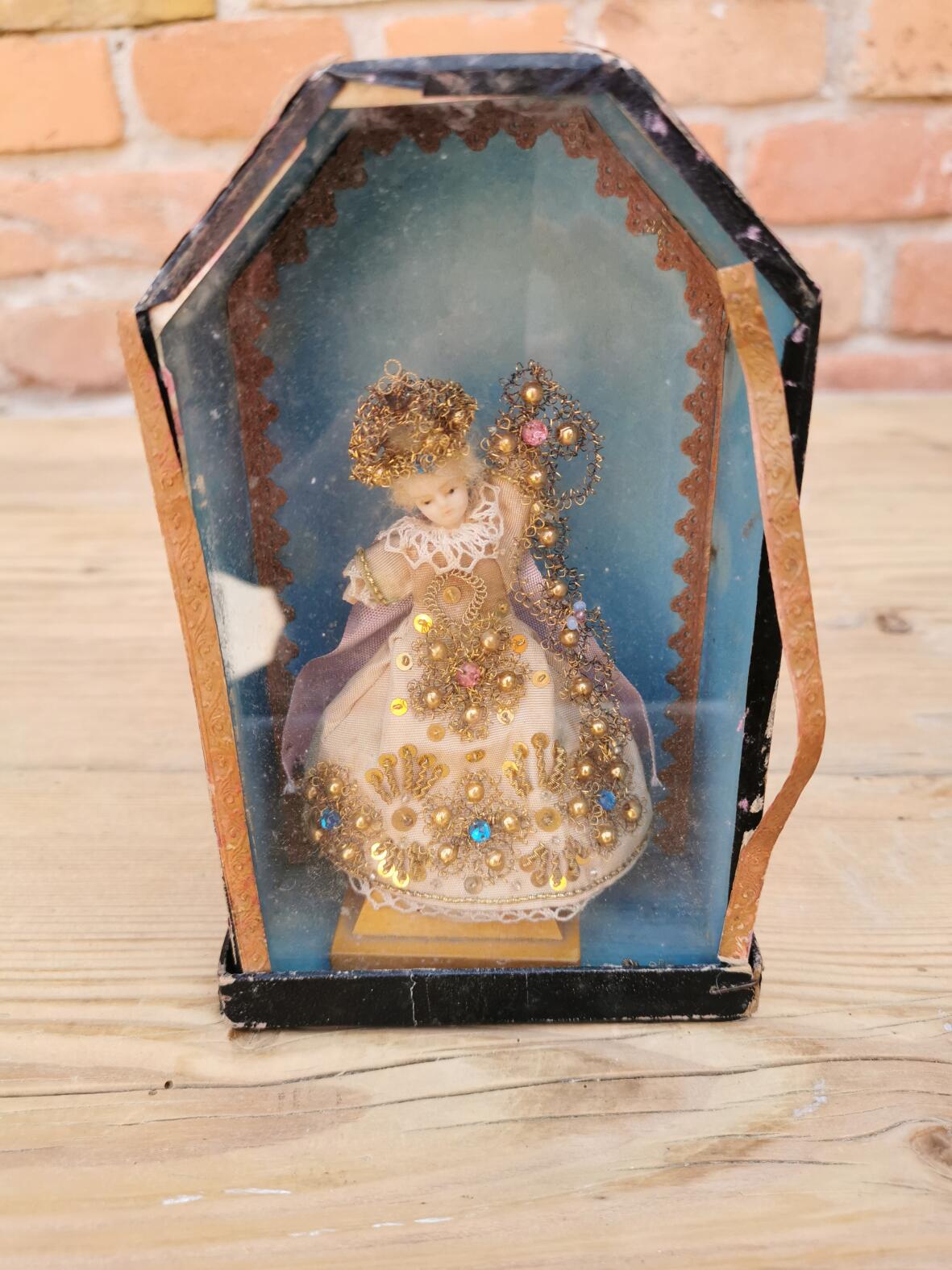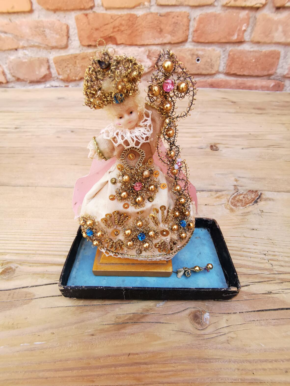 Püppchen mit Kleid, Goldverzierungen und Krönchen.