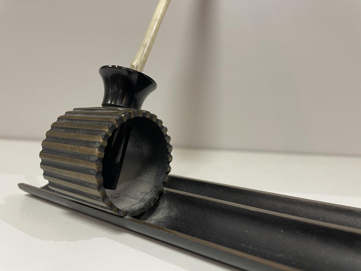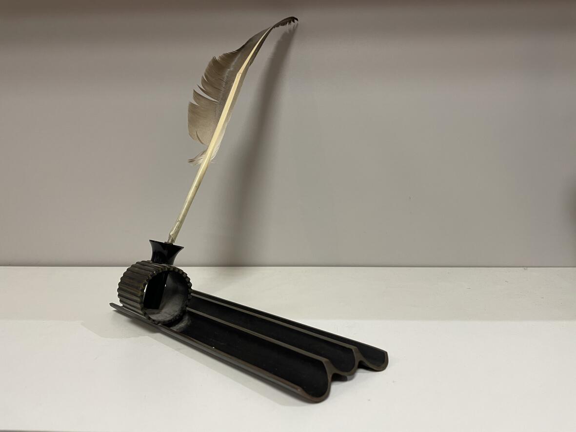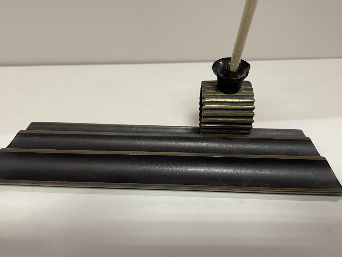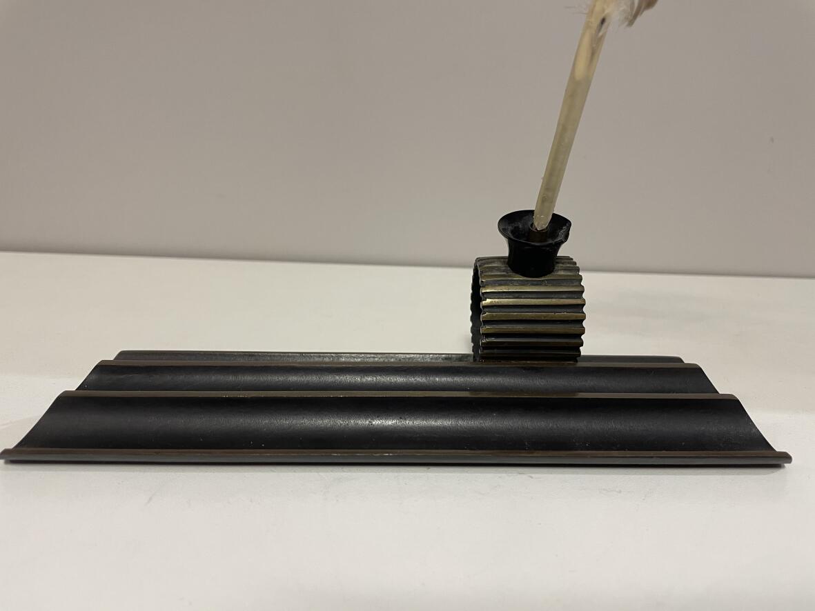 Schreibgarnitur erzeugt um 1950, Messing, schwarz patiniert, an den erhabenen Stellen poliert.