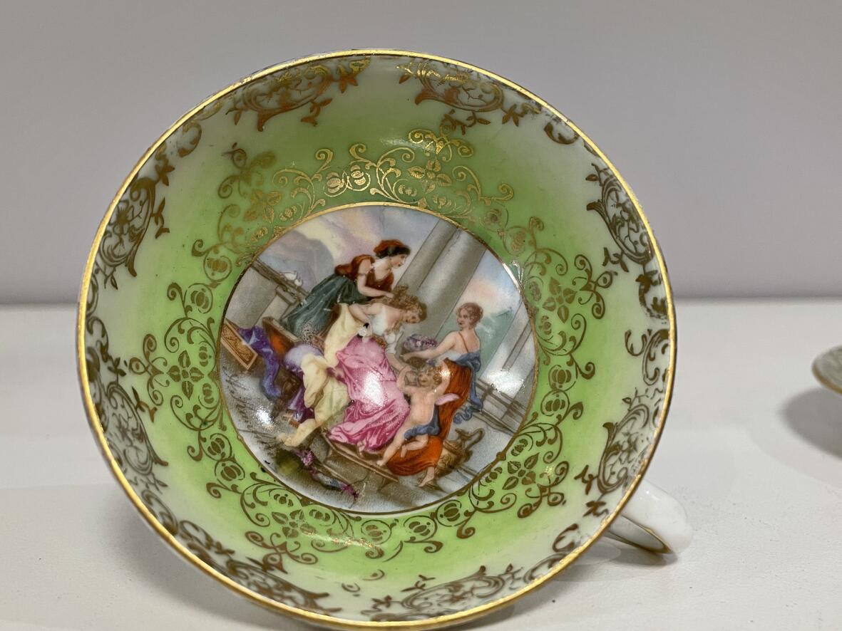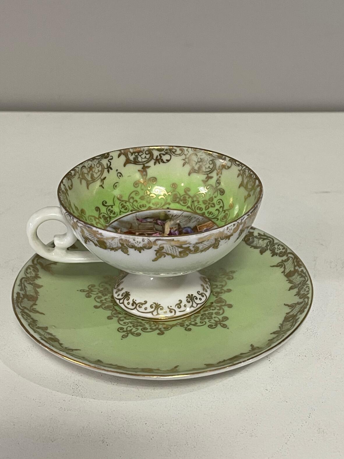Darstellung: im inneren der Tasse gedruckte antiksierende Szene mit Beschriftung "A. Kaufmann", offenbar nach Bild von Angelika Kaufmann