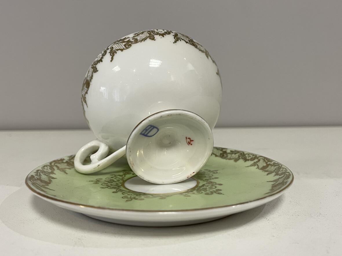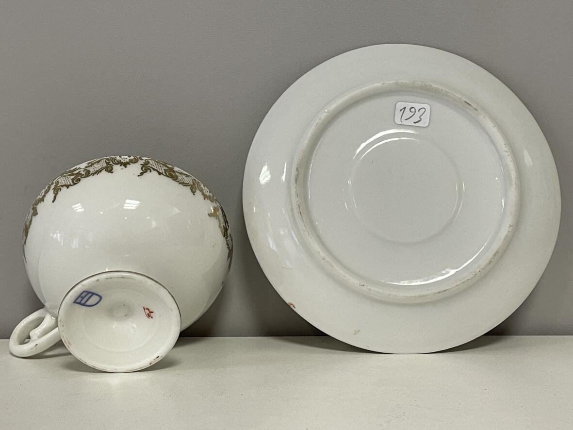 Marke: aufglasurblau aufgedruckte Bindenschild-/Bienenkorbmarke mit Punkt in Anlehnung an die Wiener Porzellanmanufaktur; aufglasurrot aufgemalte Zahl unleserlich (alles an Unterseite der Obertasse)