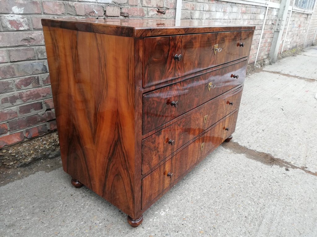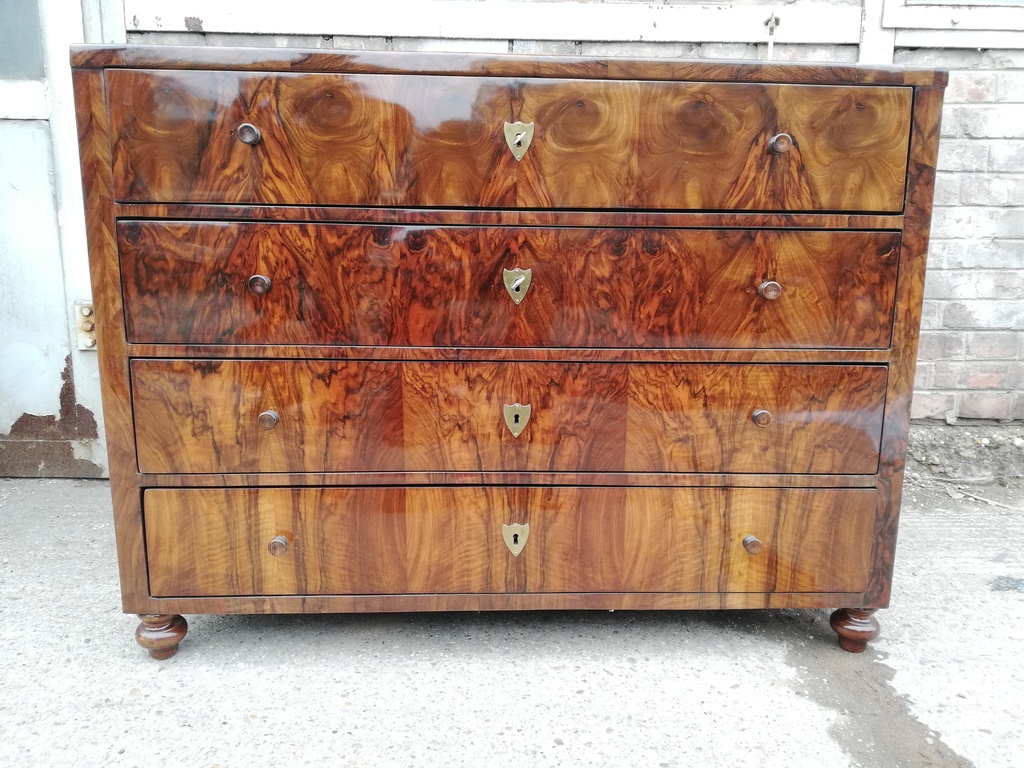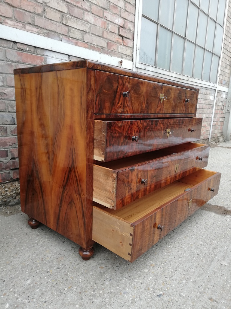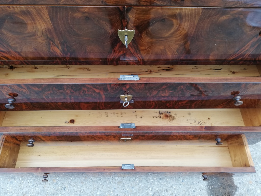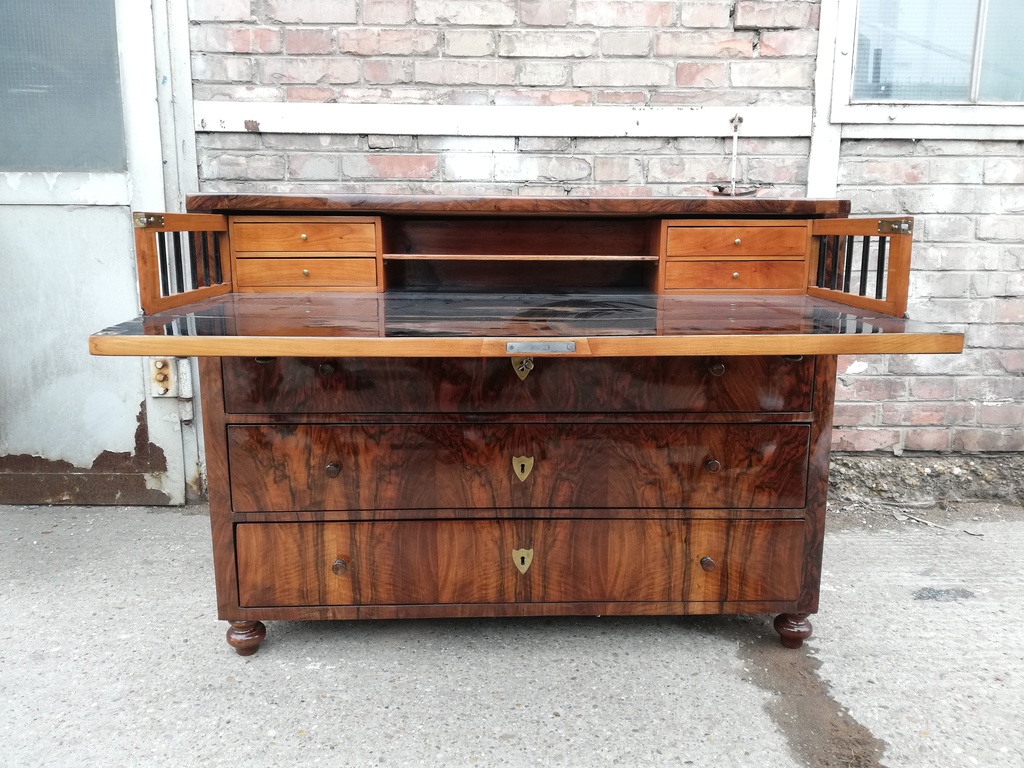 originale Schreibkommode Biedermeier um 1830, 3-ladig, oben ausziehbares Schreibfach front des Schreibfaches vorklappbar in Schreibfach 4 kleine Laden, mittig regalbrett, original schellack politiert,