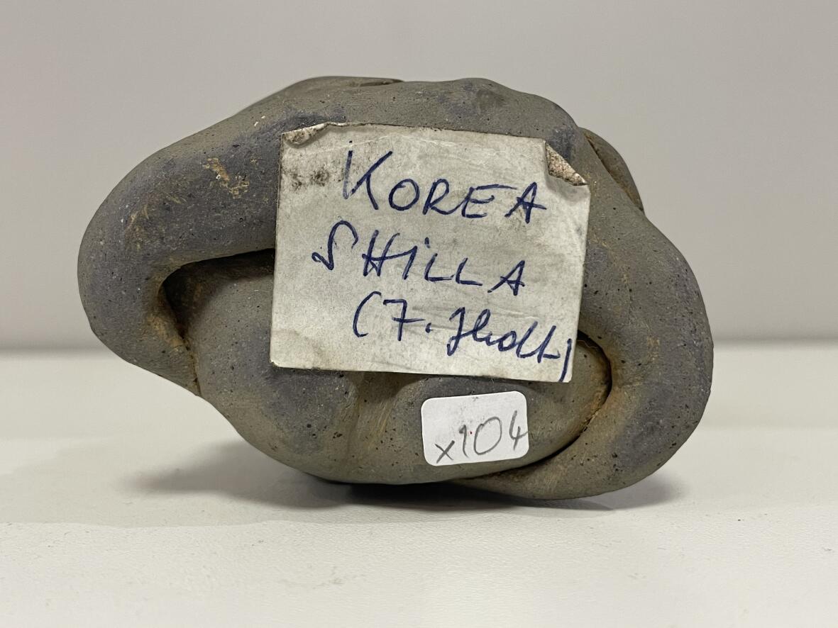 Signatur/Marke: an der Unterseite Klebeetikett mit Kugelschreiberaufschrift "KOREA SHILLA (7. Jhdt.)"