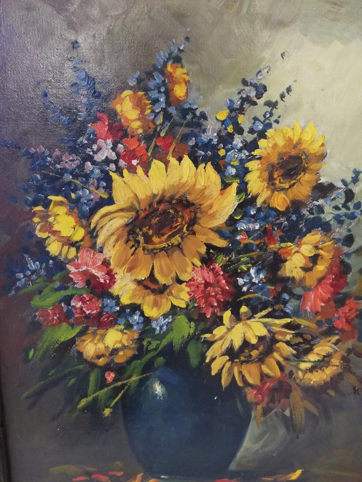 Motiv: Sonnenblumenstillebe auch blaue und rote Blumen sichtbar