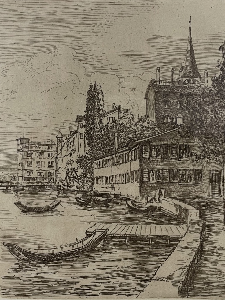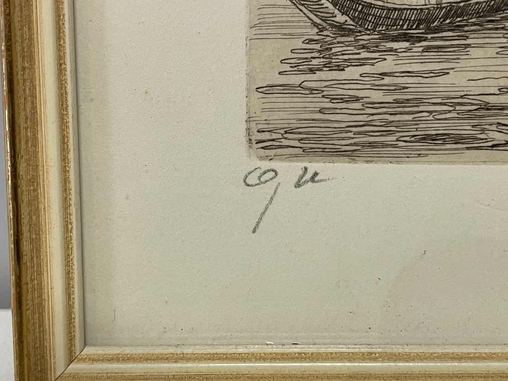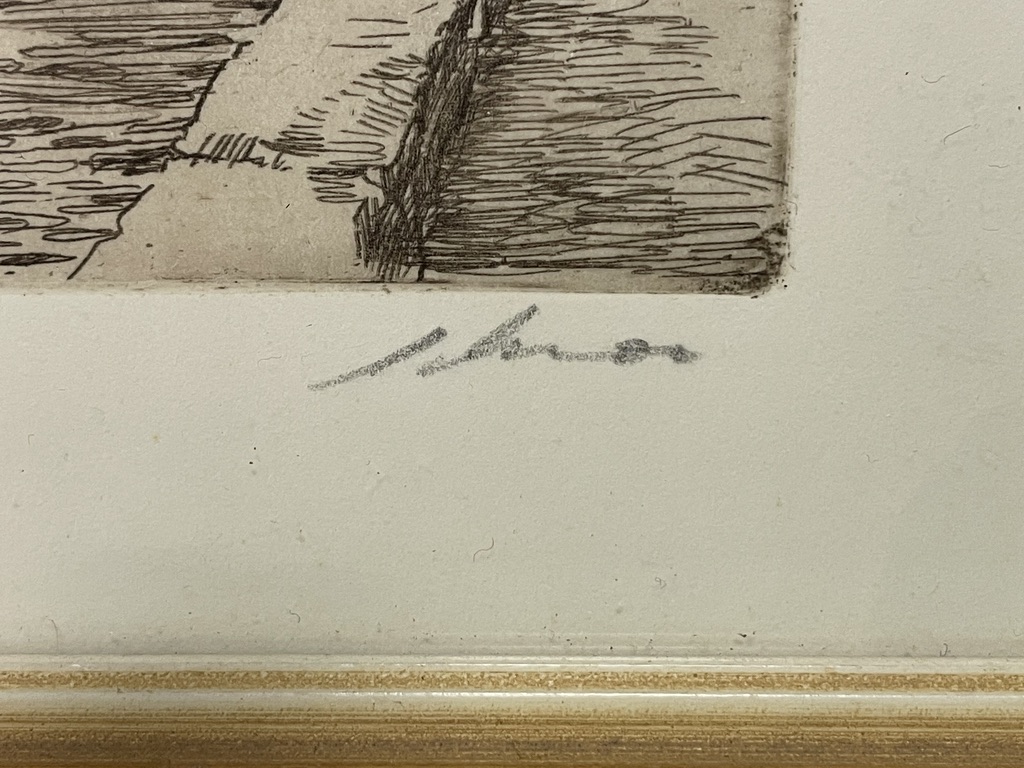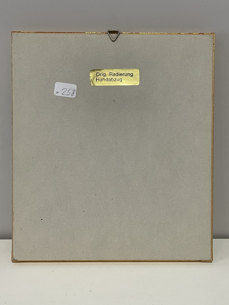 Signatur: links unten unleserliche Bschriftung; rechts unten unleserliche Signatur, beides in Bleistift; Etikett an der Rückseite: "Orig. Radierung Handabzug"
