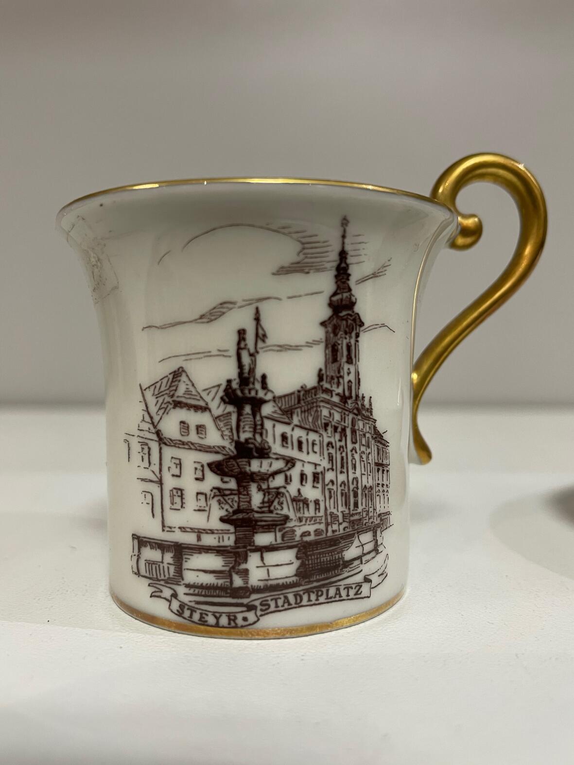 Darstellung: Stadtplatz von Steyr auf Obertasse aufgedruckt mit Beschriftung "STEYR . STADTPLATZ"