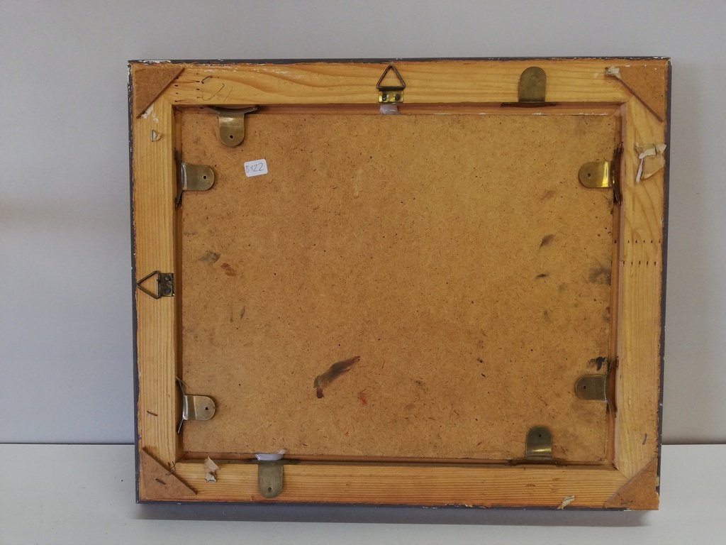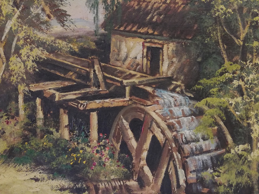 Motiv: Kleine Mühle im Wald, vorn Mühlrad mit Wasser