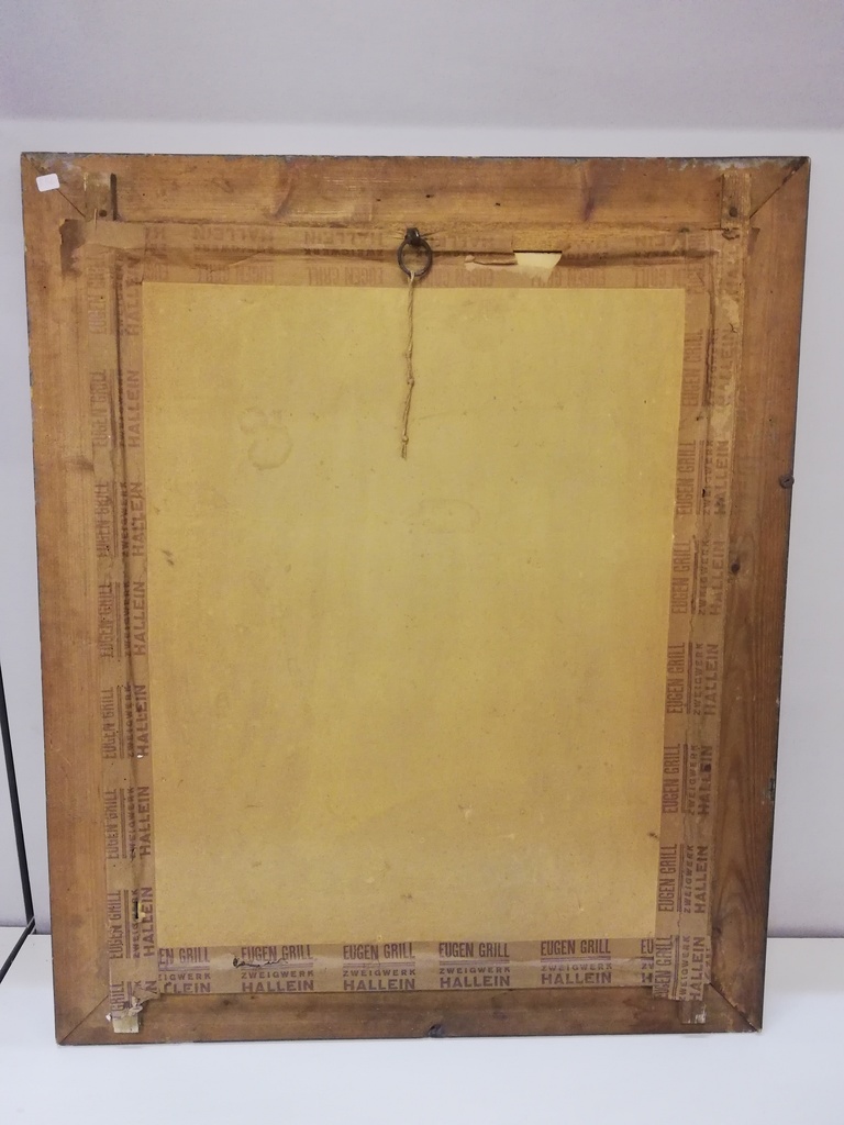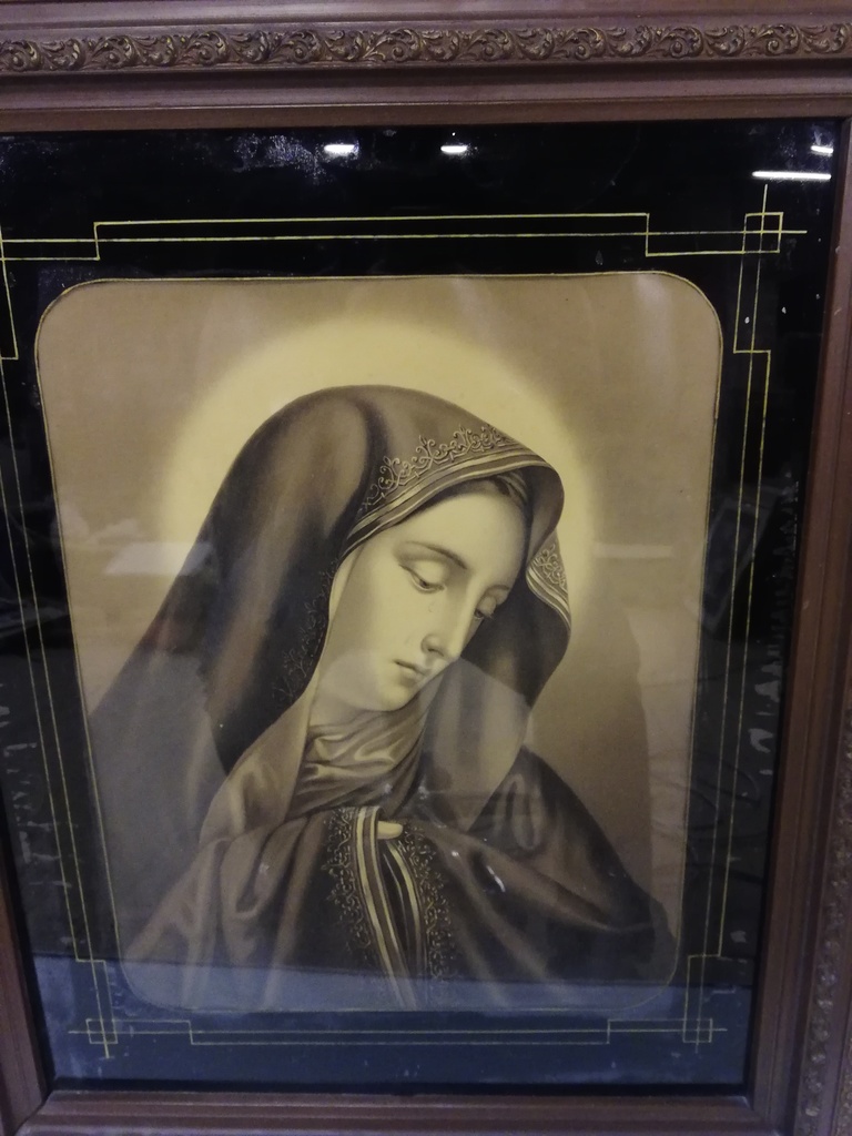 um 1900 Papier hinter Glas, am Glasrand schwarze Rahmung mit goldenem Fadendekor, Maria Sepiafarben, gedruckt