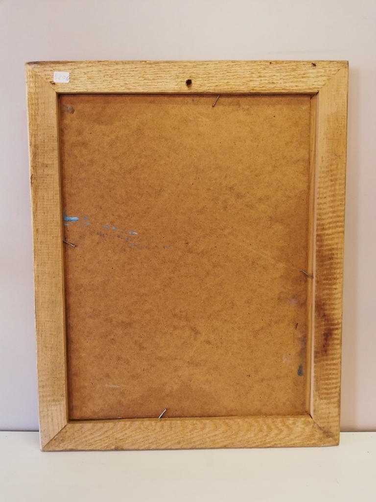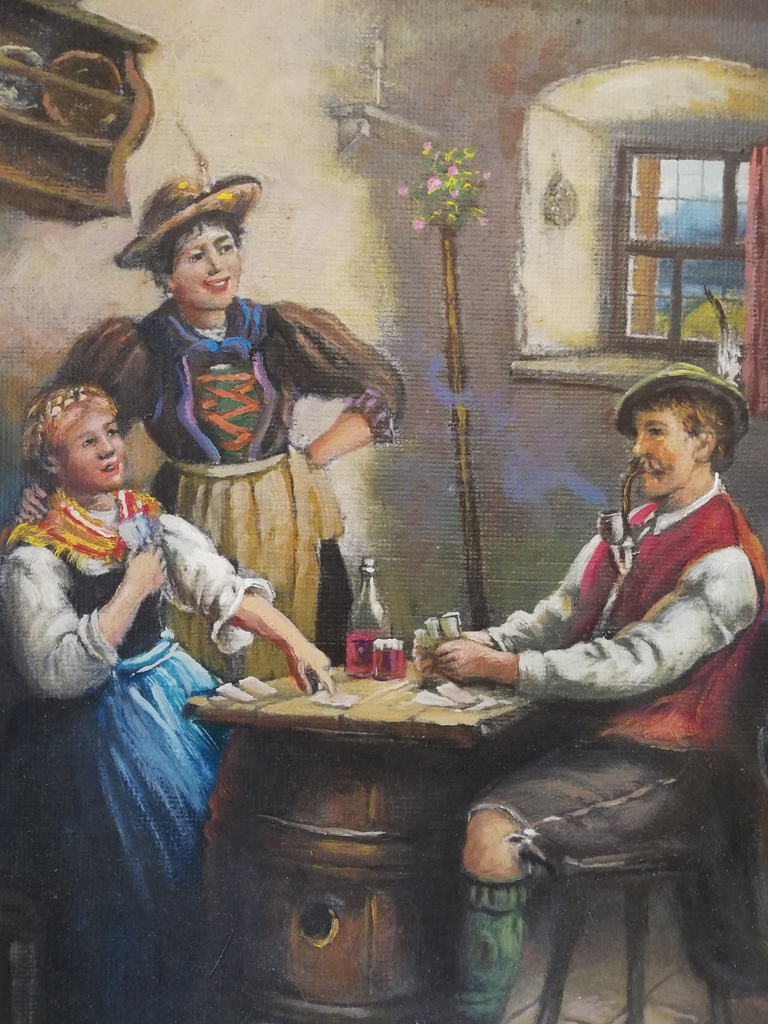 Motiv: Tischplatte auf Faß, links 2 Frauen, rechts Mann
