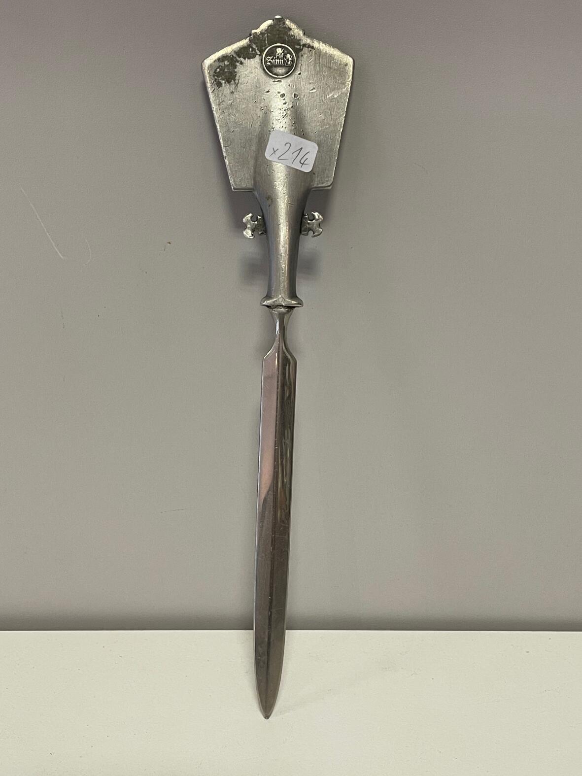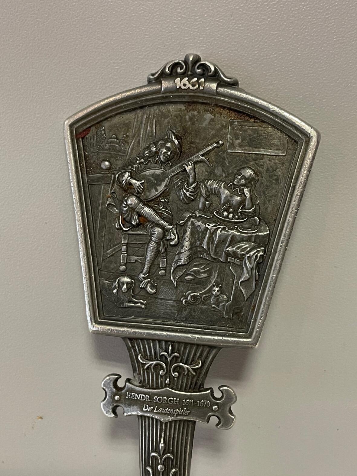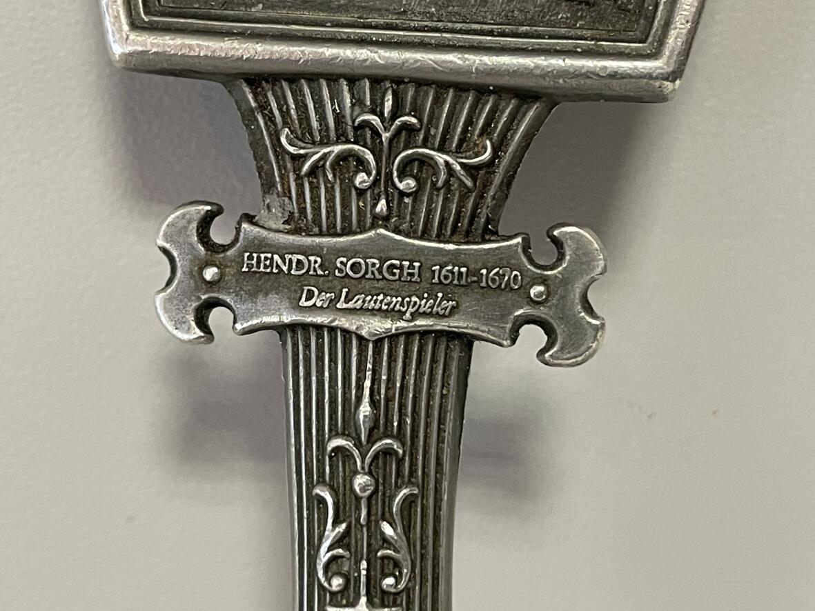Darstellung: am Griff historisierendes Relief im Barockstil: Mann spielt Frau auf Laute Ständchen; oben steht "1661", unten steht "HENDR. SORGH 1611-1670 Der Lautenspieler"; Stahlklinge